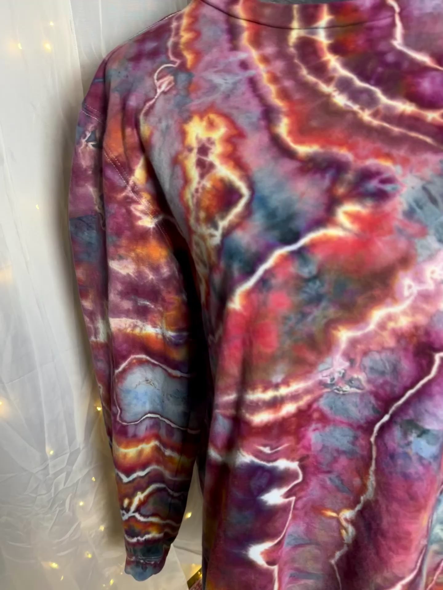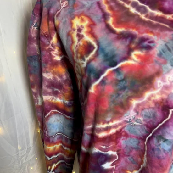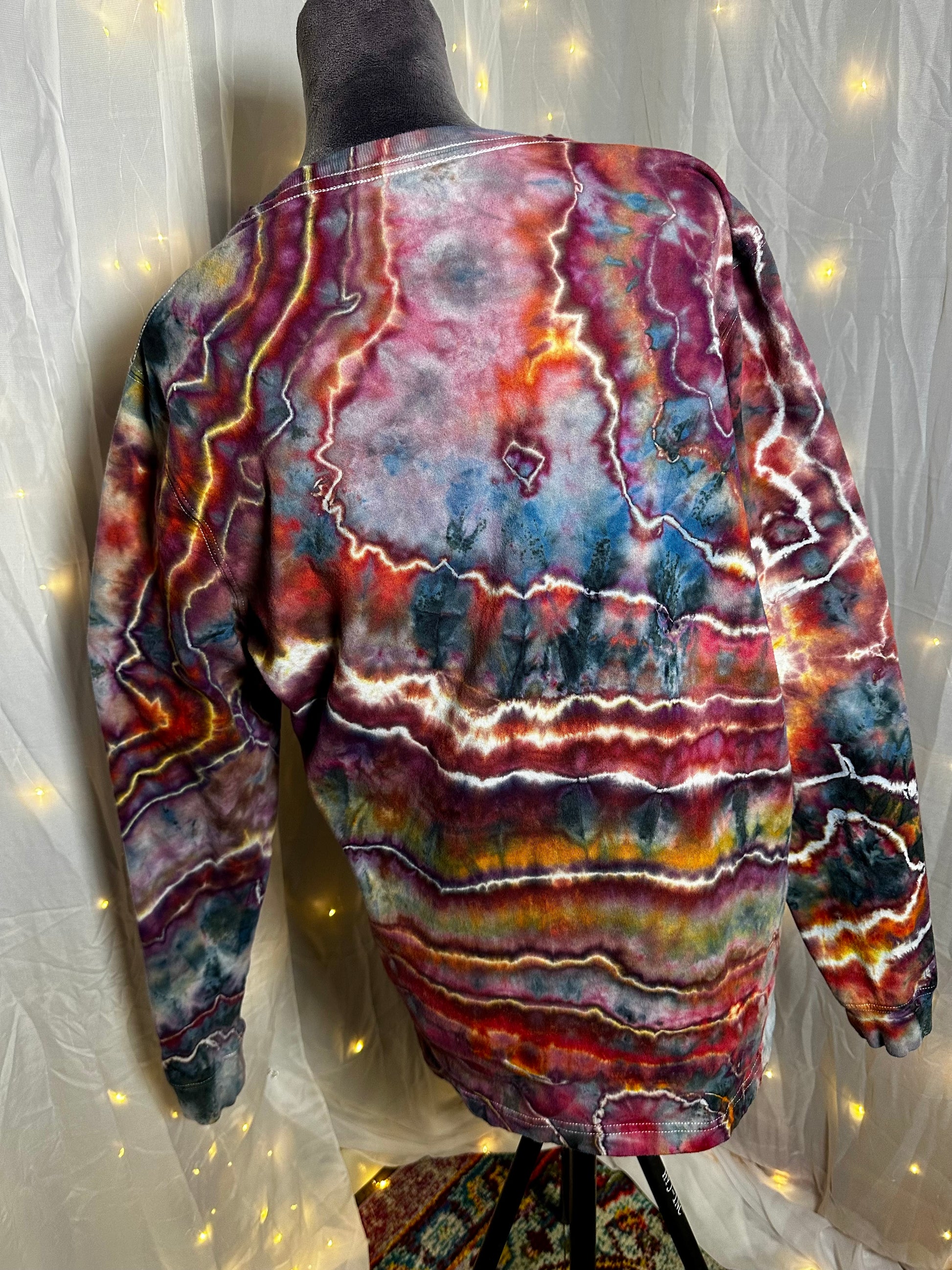 Hand-dyed in deep crimson, stormy purples, moody blues, and lightning-like crackle lines, this design looks like a gateway opening between worlds. No two are ever alike, making this a true wearable work of art.