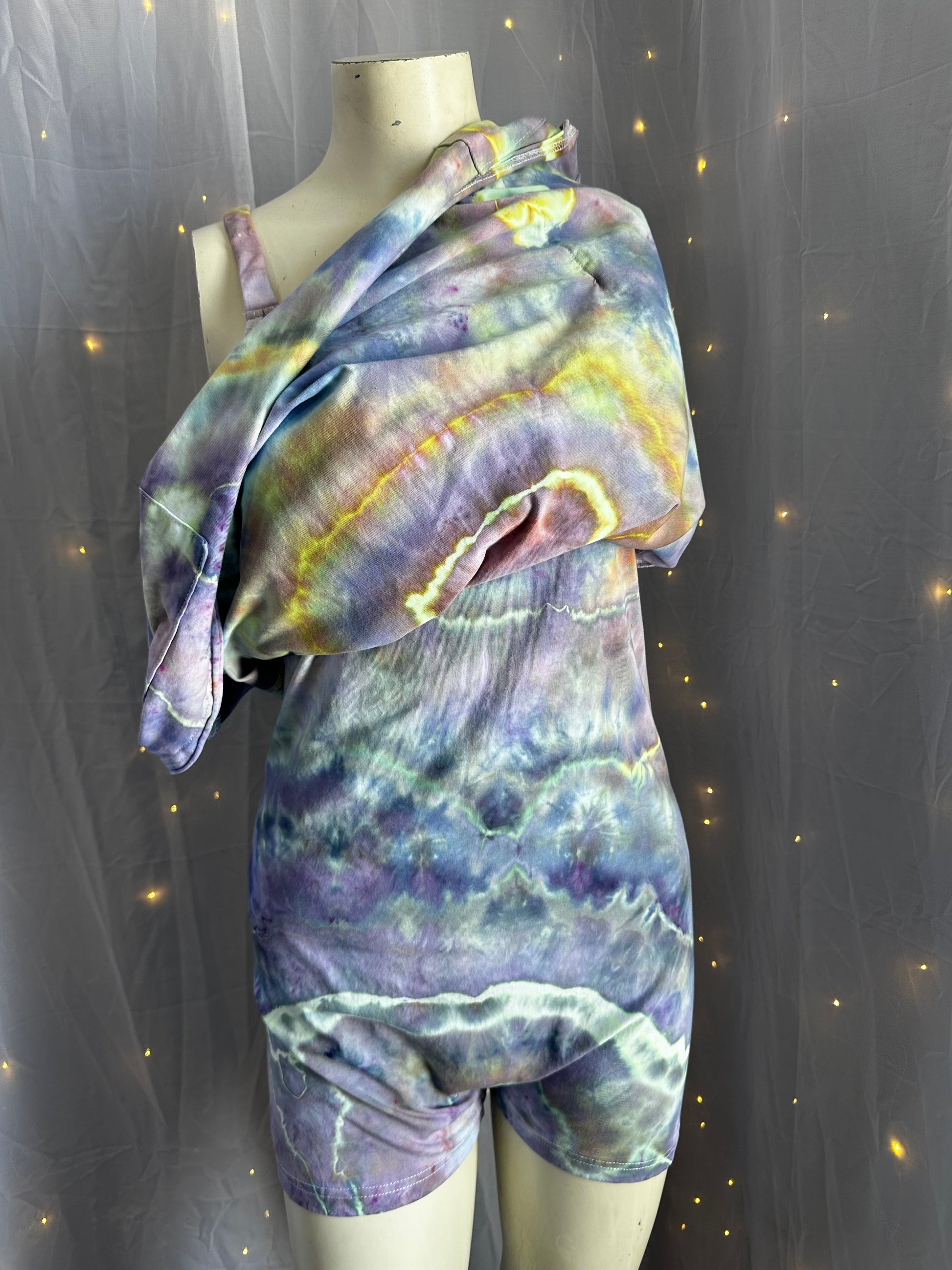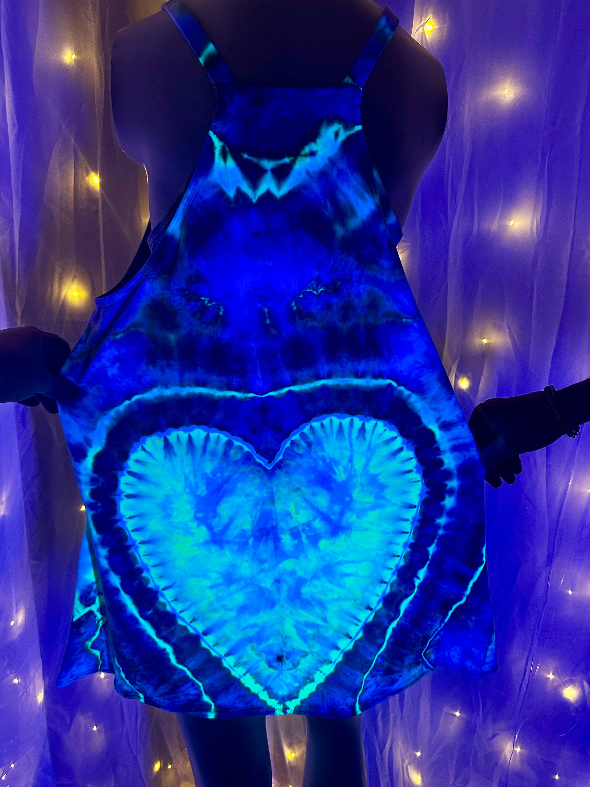 lunar love burst romper, uv reactive romper, festival romper, tie dye romper dress, blacklight clothing, hippie romper, rave outfit women, boho festival outfit, glowing heart dress, handmade tie dye clothing, boutique festival wear, summer romper women