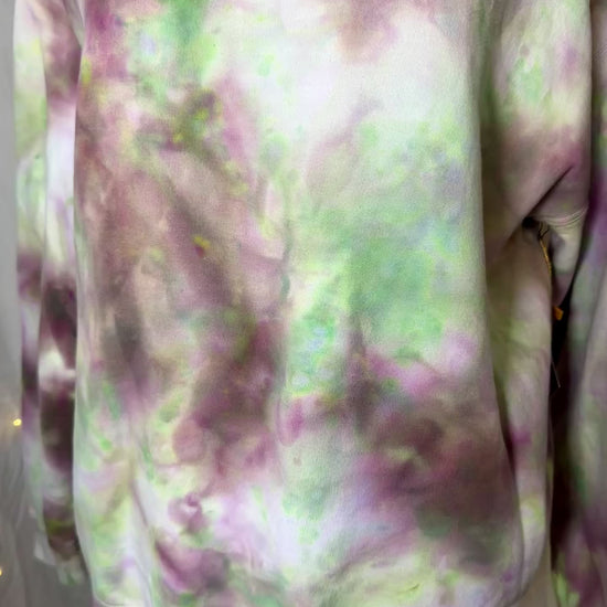 Wild Gardens features a soft, dreamy tie-dye blend of muted plum, mossy green, and creamy neutral tones, giving it an earthy, botanical feel. The dye pattern has a gentle, cloud-like flow with natural variation throughout, making this piece feel organic and serene. The overall look is calm, grounded, and wearable — perfect for everyday comfort with a touch of artistry.