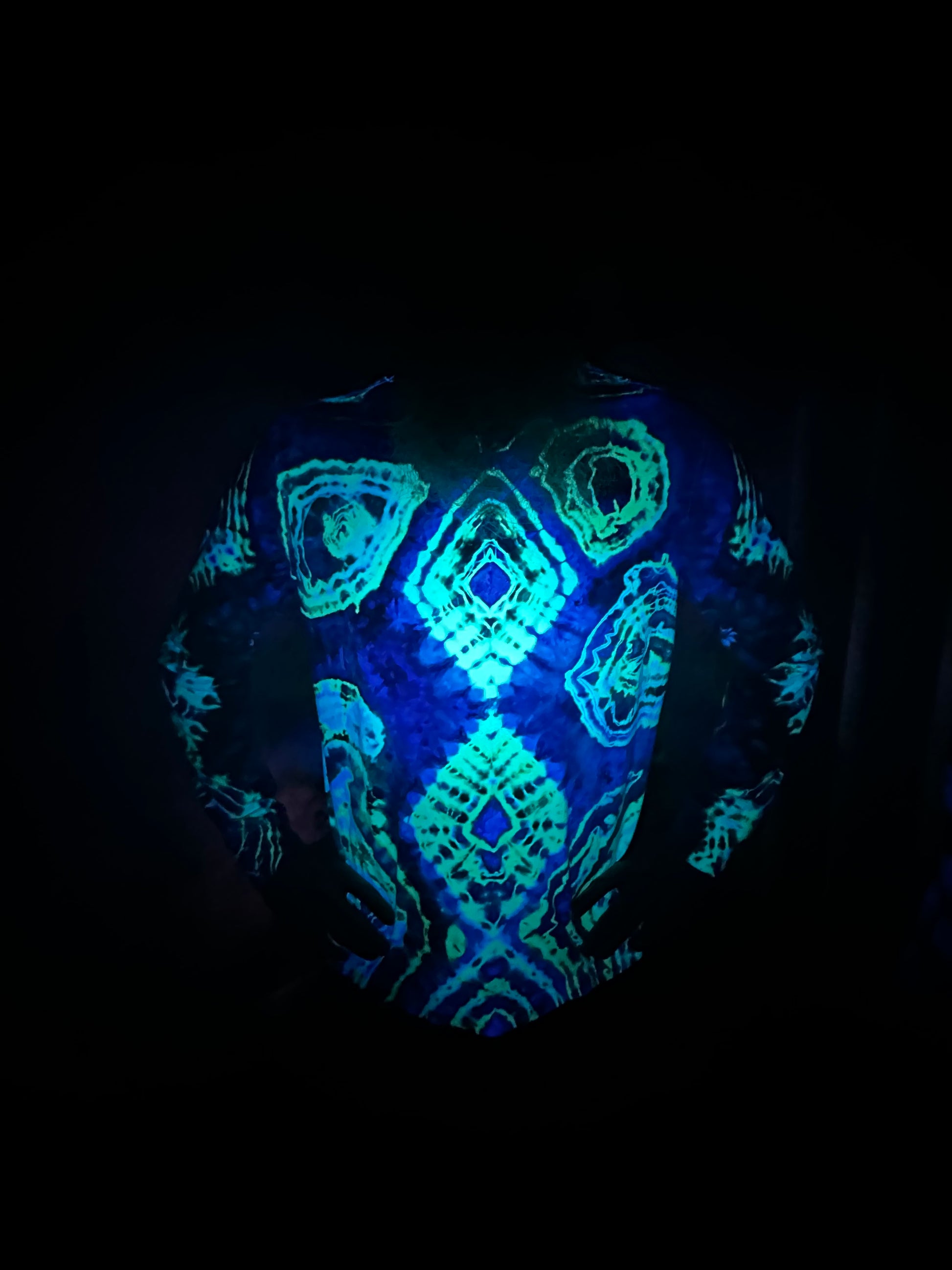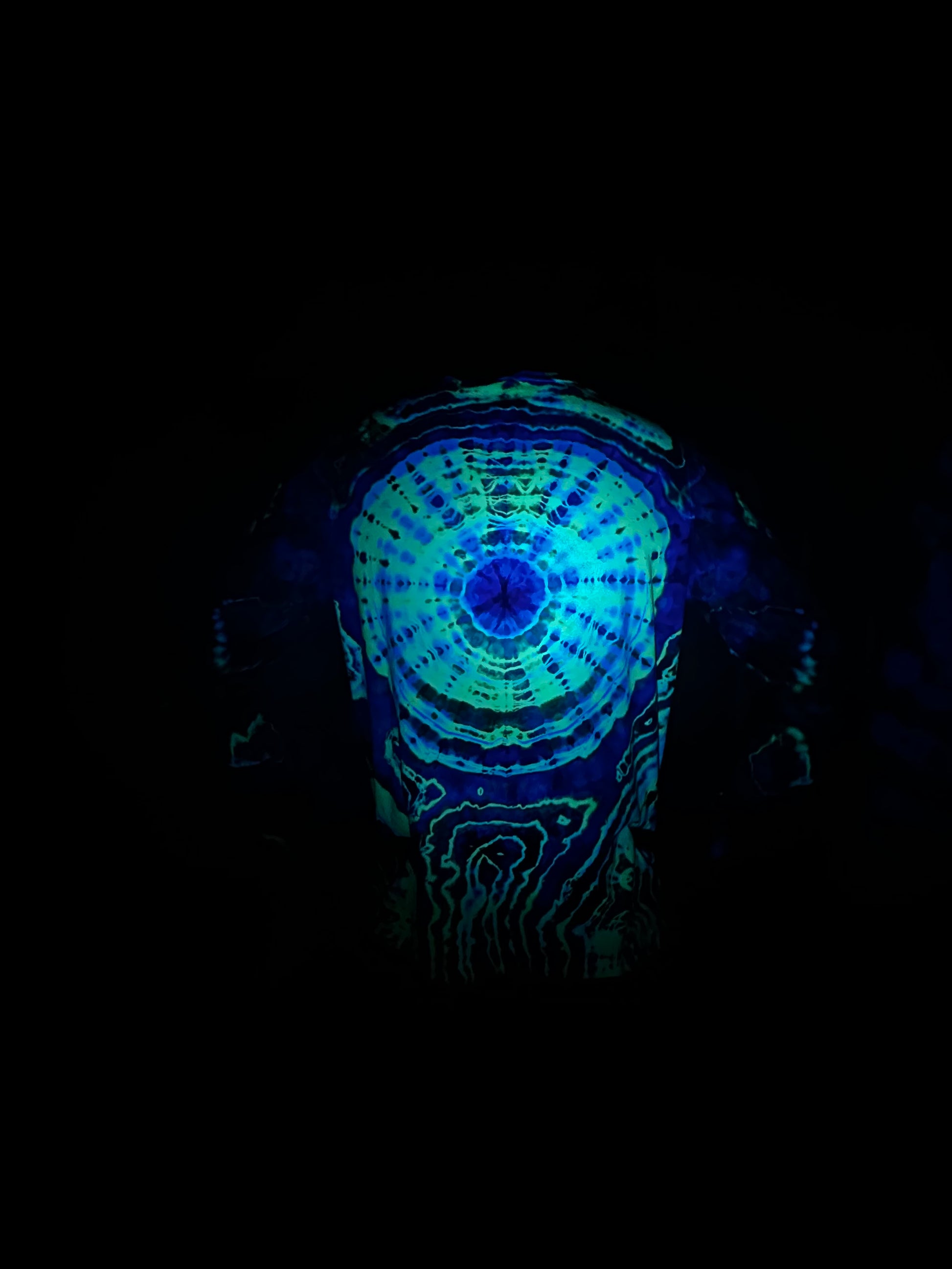 Stand out day or night in this one-of-a-kind, hand-dyed UV reactive long sleeve tee. Featuring a bold mandala design on the front, a striking spine detail on the back, and fully customized sleeves, this piece is truly wearable art. Under blacklight, the UV dyes come aliveāmaking it perfect for festivals, raves, concerts, or everyday statement wear.