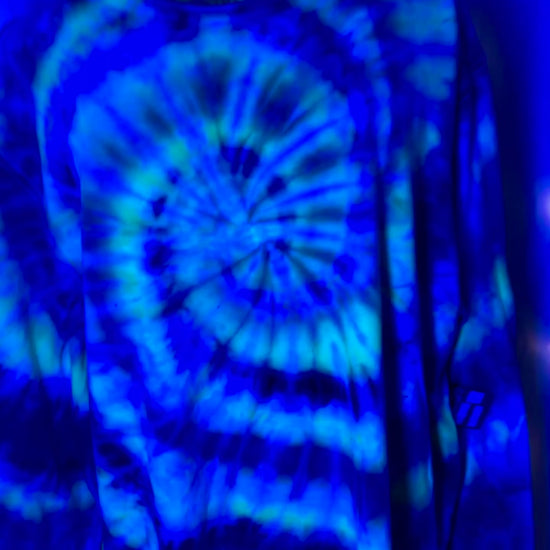 Meet the Black Light Blue Surge Spiral Long Sleeve Tee — bold by day, electric by night. This striking spiral blends vivid blues, teals, and cool-toned hues that transform under blacklight, creating a glowing surge effect that commands attention.