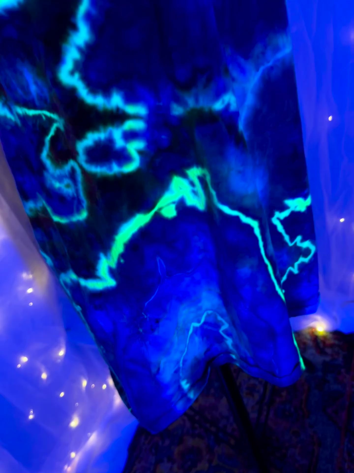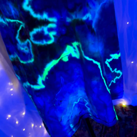 The Midnight Voltage Tee is pure electric energy. By day, it’s a deep cosmic storm of rich blues with lightning-like streaks flowing across the fabric. Under UV or blacklight? It absolutely comes alive — glowing with bold, high-voltage intensity.